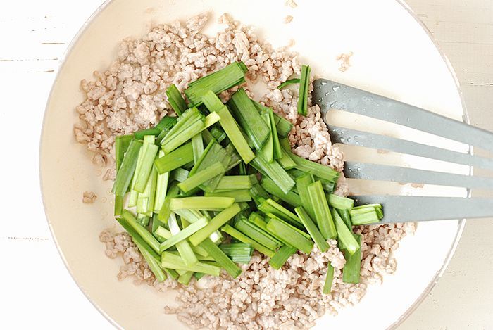 ② フライパンにごま油を熱し豚ひき肉を炒める。肉の色が変わったらニラを加え更に炒める。