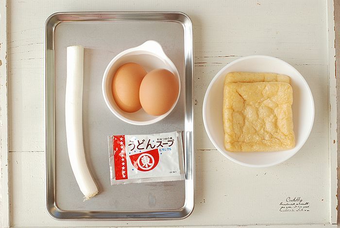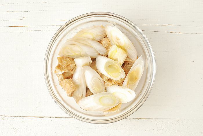 ① 油揚げは熱湯を回しかけ1cmの角切りにする、白ネギは5mm幅のななめ薄切りにする。
