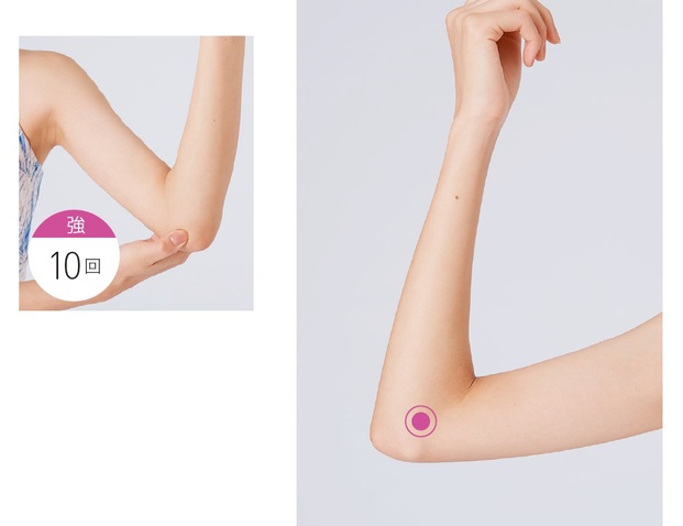 肘関節の小指側にあるくぼみ。肘を軽く曲げるとわかりやすい。親指と中指で肘を挟むようにして奥に響くようにプッシュ。