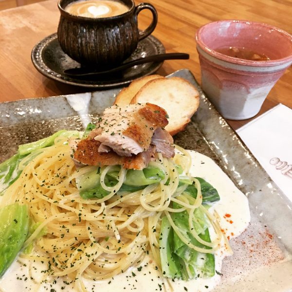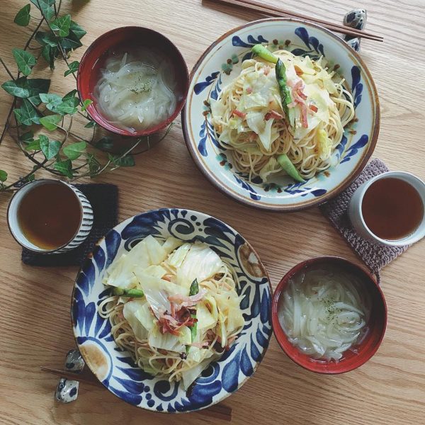 こちらはキャベツとアスパラとベーコンの和風ペペロンチーノです。