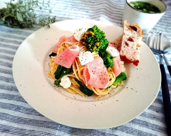 春が旬の菜の花と生ハムを使った和風クリームチーズパスタです。