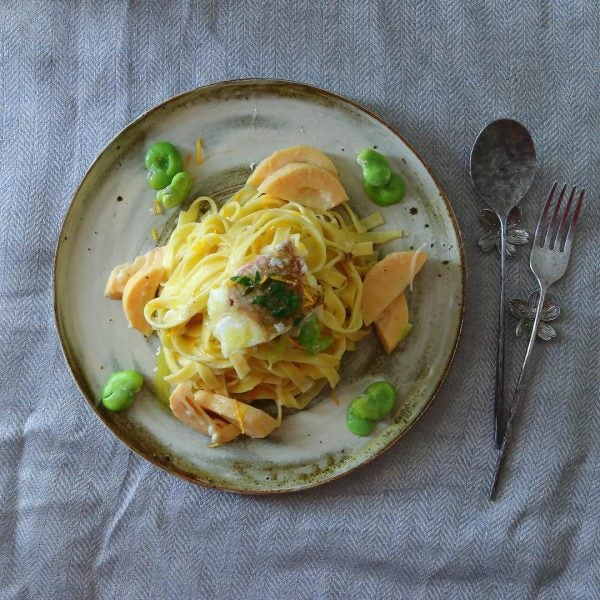その真鯛をメイン具材にして春野菜のタケノコと空豆を合わせ、パスタは平たく薄い麺のフィットチーネを使ったおしゃれなパスタ。