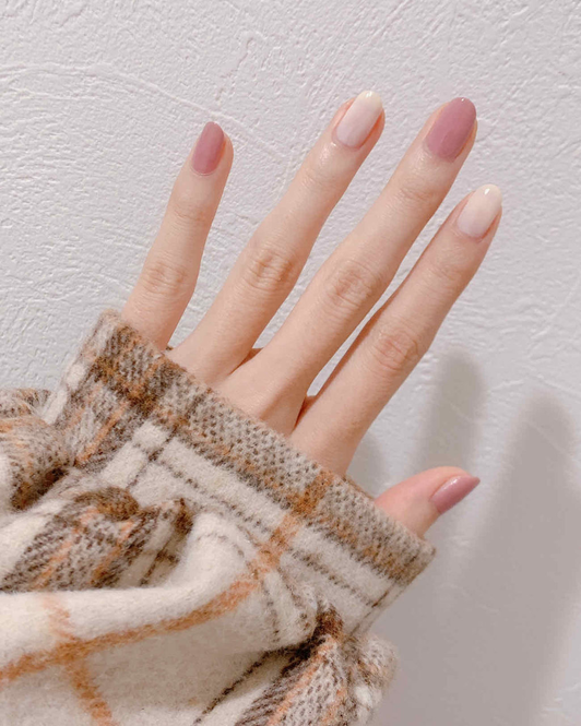 お休みの日はもちろんオフィスネイルとしても活躍しそうなのが、淡いピンクとベージュを合わせた清楚で控えめな2色ネイルです。どちらも少しくすんだトーンなので、大人の手肌にしっくり馴染みます。