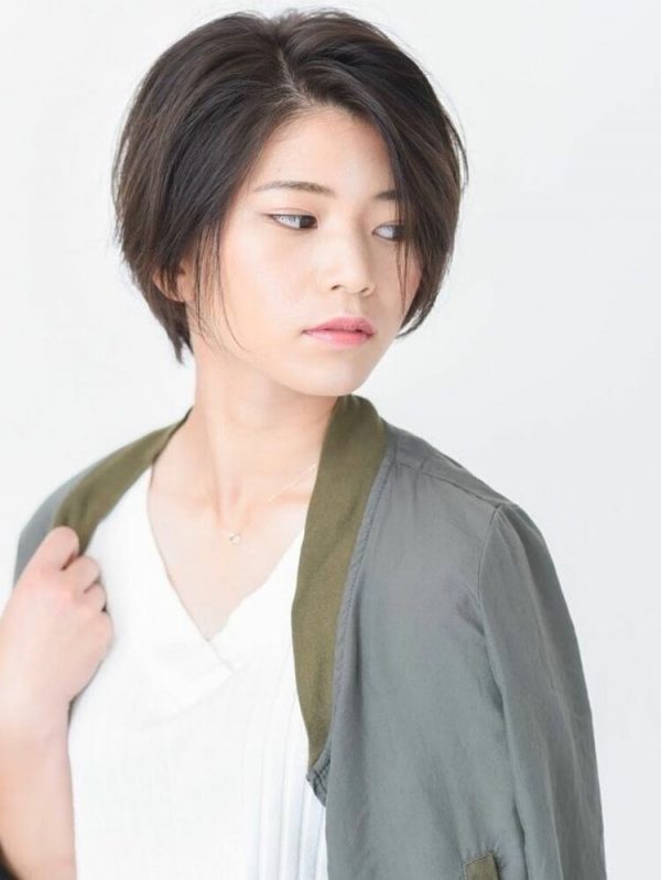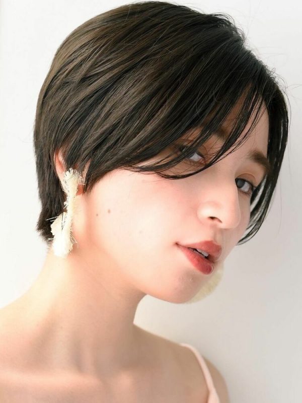 黒髪や暗髪にして長めの前髪を目にかかるようにおろせば、やわらかい雰囲気になりがちな丸みショートもかっこいい雰囲気の髪型になります。