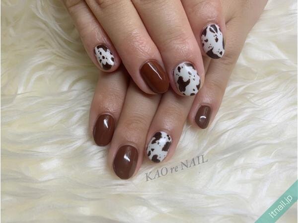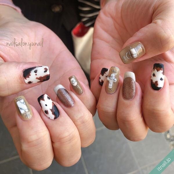 一般的にブラック×ホワイトで作られることの多いうし柄ですが、おしゃれな雰囲気にこだわったうし柄ネイルはブラウンにお任せ。まるでカウボーイを思わせるようなブラウン×うし柄が、いつもよりおしゃれな指先を演出。