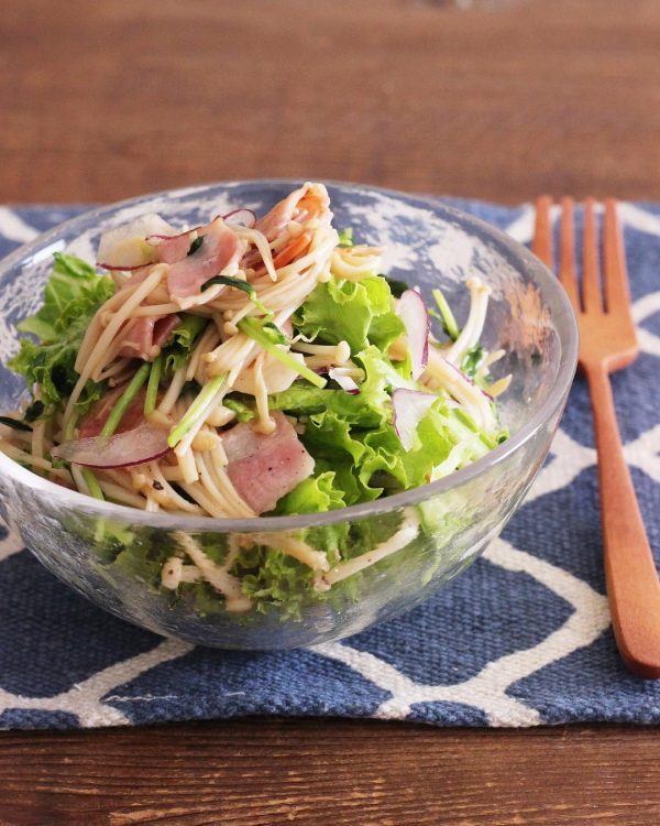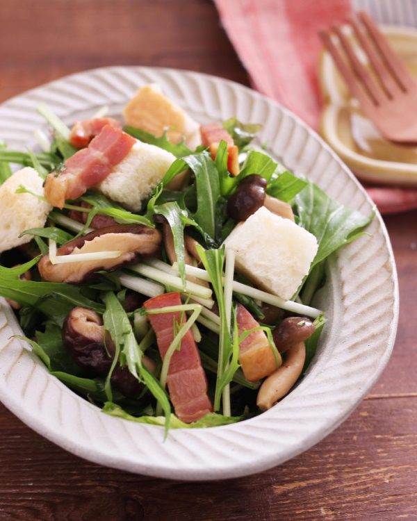 しめじ、しいたけ、厚切りベーコンをバター醤油でソテーして、グリーンリーフや水菜など生野菜と和えます。