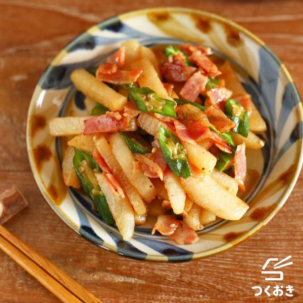 オクラと一緒にベーコンも加えて旨味をアップさせて、コンソメ醤油味があっさり系の牡蠣鍋の献立にも合うおかずです。
