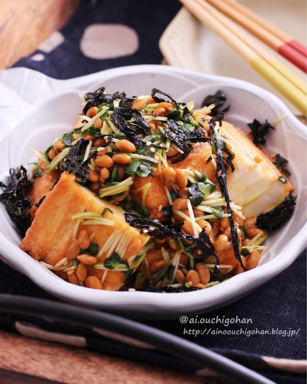 納豆はコチュジャンで韓国風の味付けにします。焼いた厚揚げに味付けした納豆を乗せ、韓国海苔や白胡麻をかけて完成。