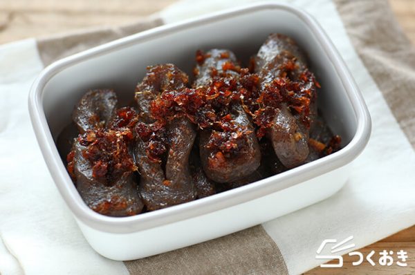 食物繊維がたっぷりのこんにゃくを疲労回復効果があるガーリック風味の味付けでいただくレシピ。