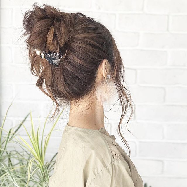 このような崩れそうなゆるいお団子はメッシーバンといい、女性らしさ、色っぽさが出ると人気があります。