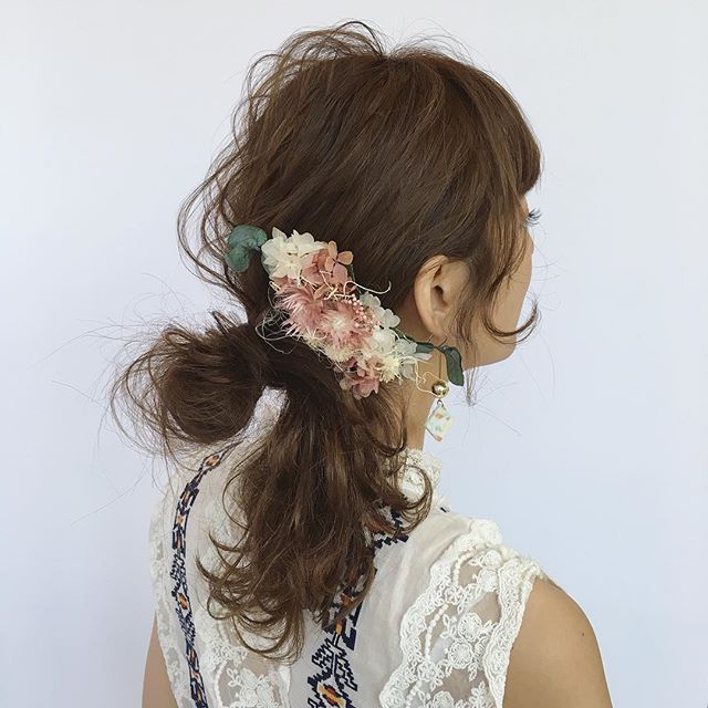 ゆるく作ったお団子に、ブーケのようなお花のヘアバレッタを合わせた大人っぽいアレンジです。