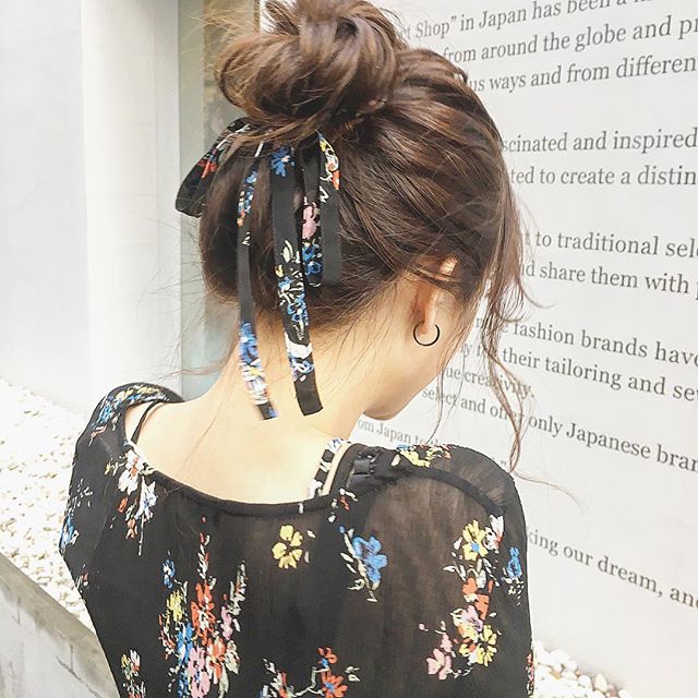 高めのお団子にワンピースとお揃いの柄のリボンを巻いて結んだヘアアレンジです。