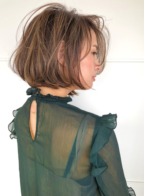 肩につくかつかないかのギリギリの長さでカットした、ふわっとエアリーなボブスタイルです。ピスタチオカラーで春らしく透明感のある髪色に。少し動きをつけるだけでスタイルが決まります。