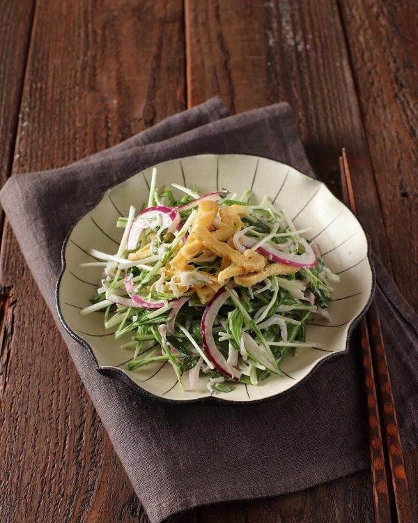 シャキシャキとした食感が美味しい水菜に、油揚げとしらすを加えて作るサラダレシピは、和風パスタ料理献立の付け合わせによく合うレシピですね。