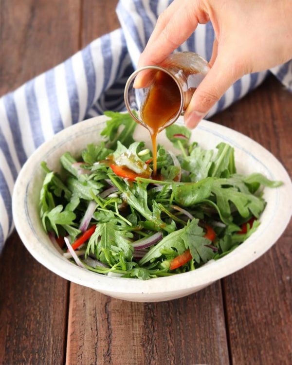 大人っぽい風味豊かな野菜、春菊とせり、そして彩り野菜を使ったパスタ料理に合うサラダは、ドレッシングがポイントです。