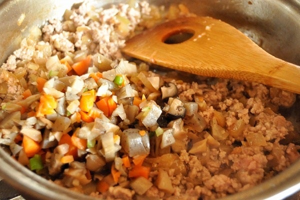 1、フライパンにサラダ油を中火で熱し、豚ひき肉を炒める。火が通ったらお煮しめと炒め玉ネギを加えて炒め合わせる。