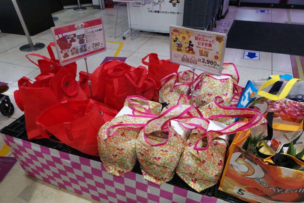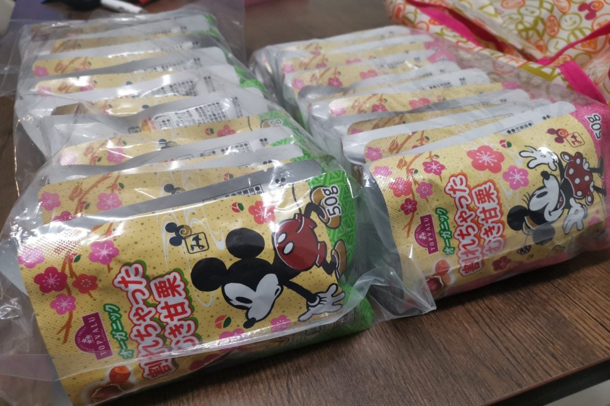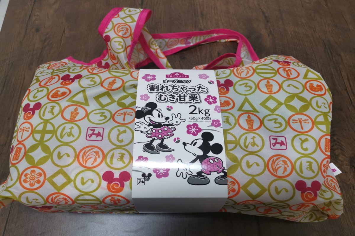 容量は2キロとかなりビッグサイズで、50グラムの甘栗が40袋小分けになっており、ディズニーのかわいいエコバッグに入って売られている。