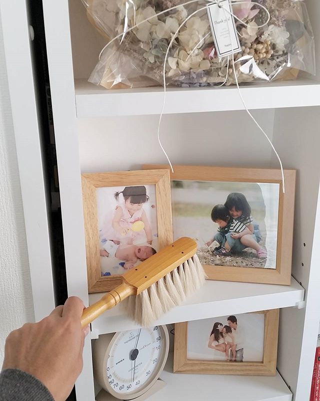 凹凸のある物が多い飾り棚のお掃除は、柔らかい毛のブラシがおすすめです。飾っている物を傷つけること無く綺麗にすることができますよ。