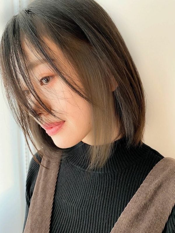 切りっぱなしボブとの相性が良い顔周りのインナーカラーは、アッシュの髪色が大人っぽくクールに仕上がります。