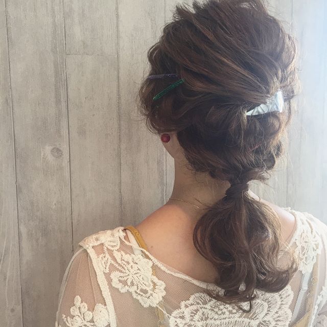 ダウンのままも良いですが、お食事などの際にローポニーのようなアップにアレンジしても素敵。