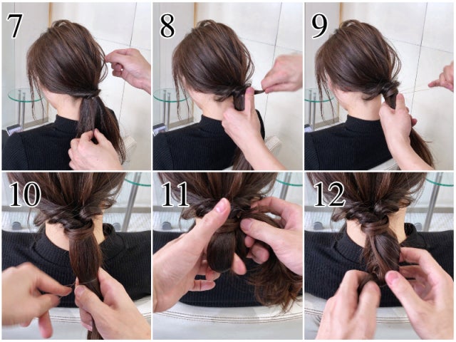 ⑧⑨ 毛先を使ってヘアゴムを隠します。