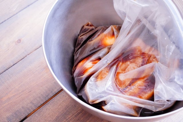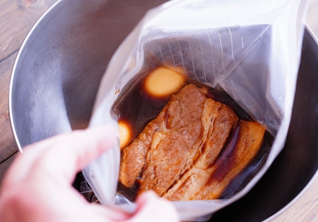 ④ ③のつけ汁の火をとめたら豚肉をいれている保存袋に入れて(この時、ボウルなどに保存袋を入れておくとこぼれたり火傷したりしないので便利ですよ。)空気を抜いて密封する。
