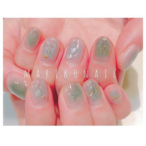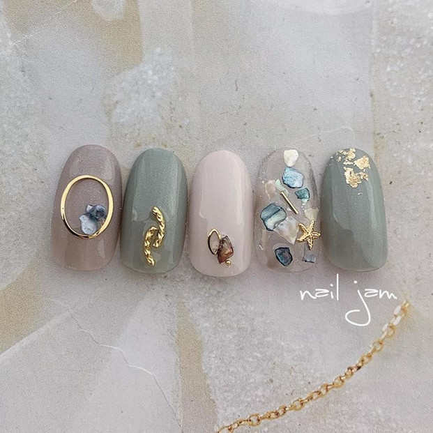 アースカラーではスモーキーグリーン、和カラーでは、草色、よもぎなどと呼ばれることもあり、グレーがかったくすみ色なので、ネイルに合わせても落ち着いた印象に仕上がるのがポイントです。