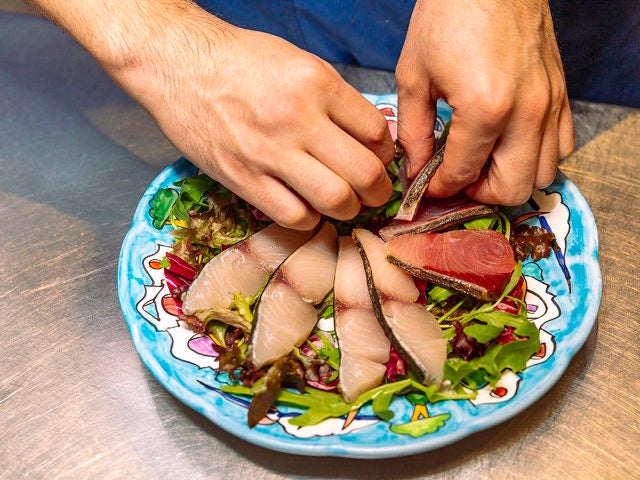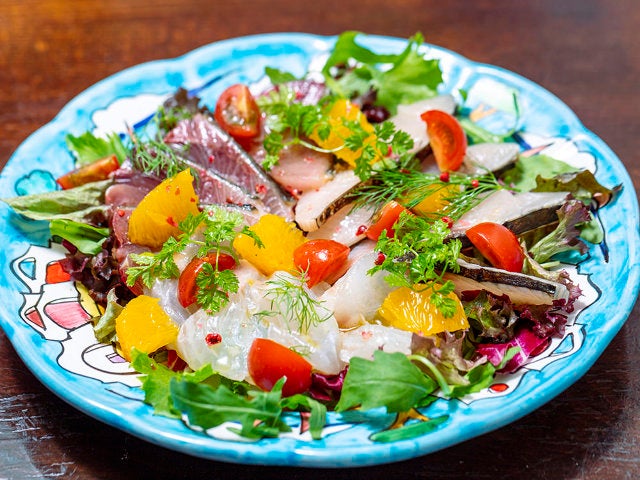 取材日は鰤(ブリ)、クエ、鰆(サワラ)の3種類。魚のサラリとした脂と塩と酸味の爽やかな味わいがワインと好相性。食欲を増す、素晴らしいスターターだ。