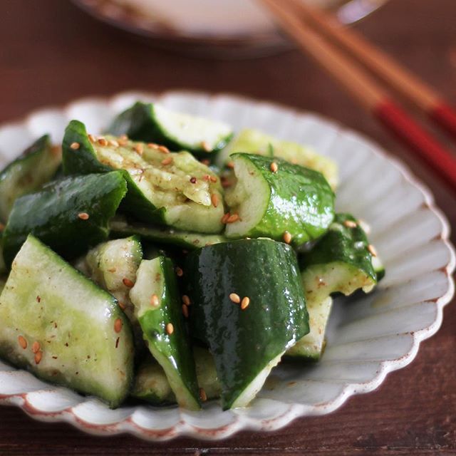 カットするのではなく砕くように叩いたきゅうりには、味が染み込みやすくなります。焼き鮭献立にもよく合いますよ。