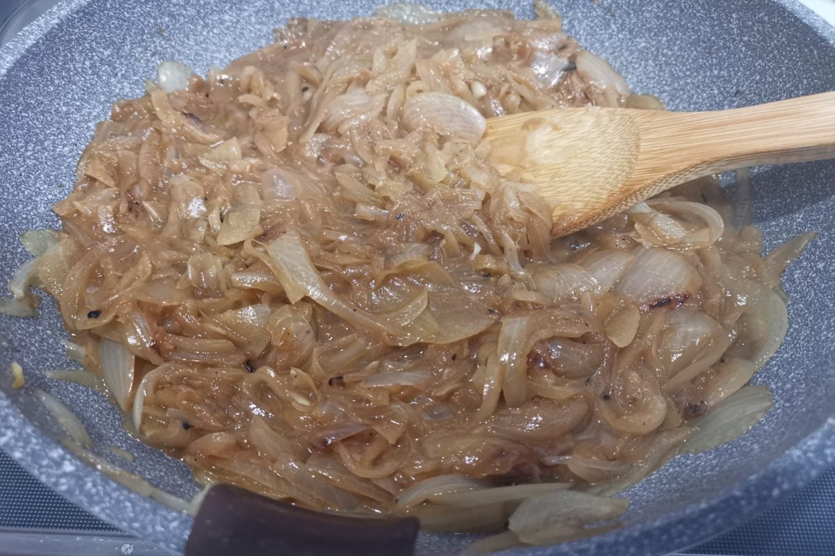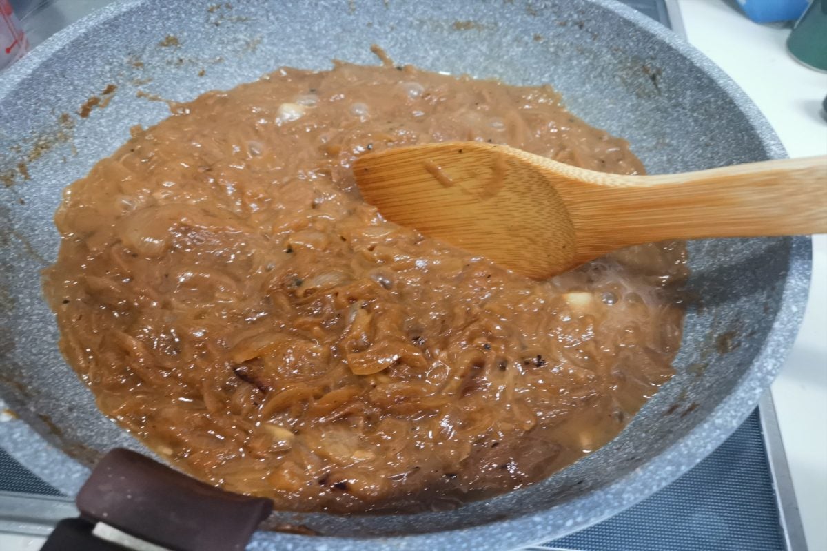 最後には濃い茶色になり、普通に炒めたときと変わらない、もしくはさらに甘いオニオングラタンスープのベースができる。これはカレーなどあめ色玉ねぎを使う料理ならなんでも材料になるので、一度に大量に作って冷凍しておいても便利だ。