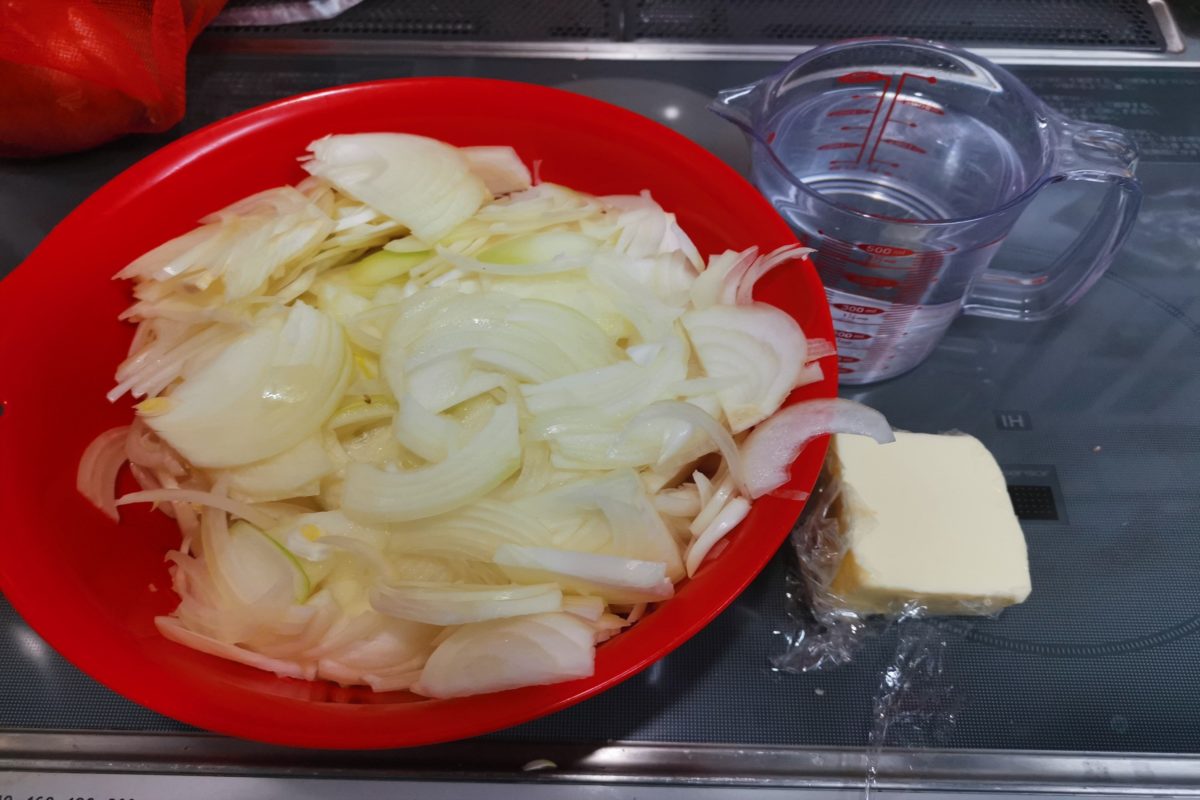 だが、そんな人でも超簡単に究極レベルの『オニオングラタンスープ』を作れる方法をお教えしよう。まずオニオングラタンスープのベースに必要な物は、玉ねぎ500グラムにバター50グラム、水500㏄だ。記者は今回倍量で作っている。
