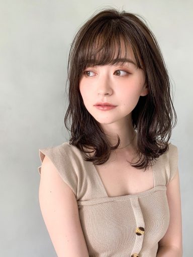 透明感高めの暗髪のスタイルにくびれ感をプラスして、ドライな質感のスタイリング剤で動きと奥行き感を演出。無造作な雰囲気に仕上げることでスッキリとした印象が強調され、おしゃれ度も一段と引き上がります。