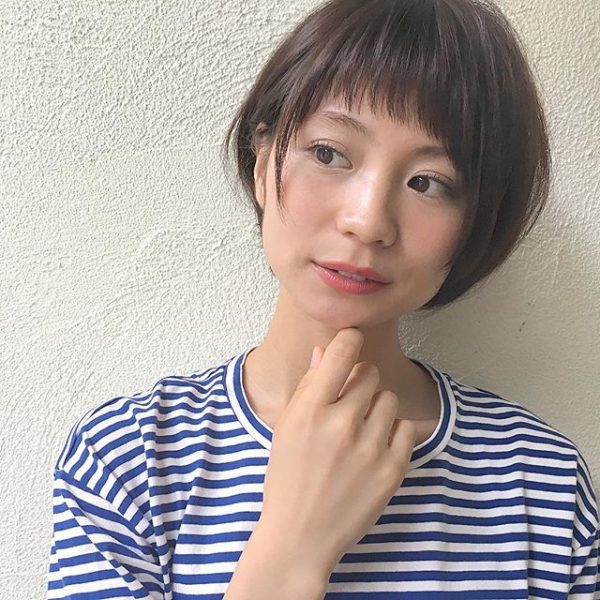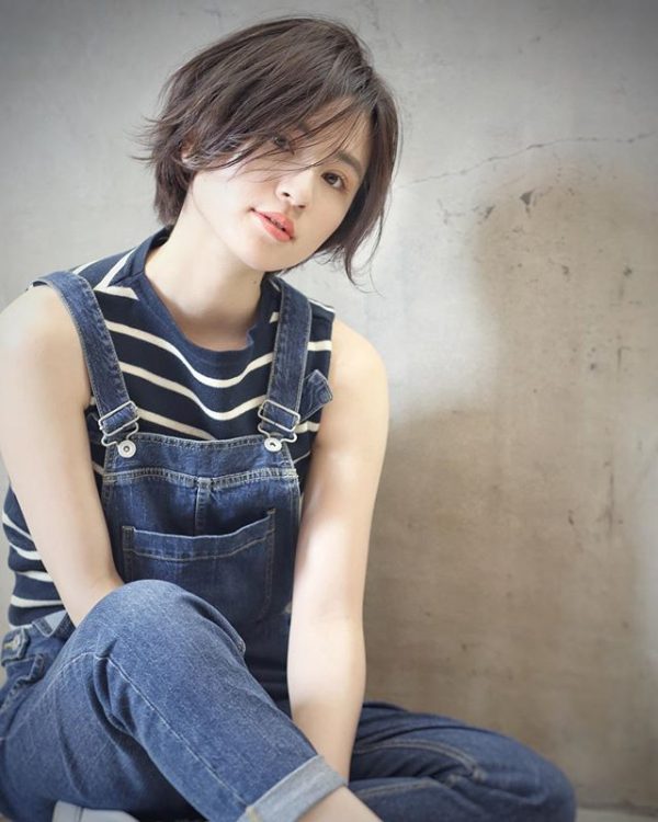 黒髪のアシメショートはナチュラルなイメージと、無邪気でカジュアルなイメージどちらも併せ持ったヘアスタイルでファッションコーデもひろがりそう。