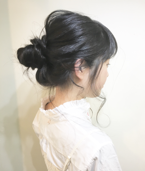 うなじが見えるお団子と細い後れ毛で、どことなく色っぽさも感じさせますね。