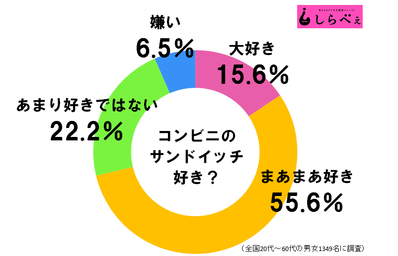 ちなみに、しらべぇ編集部が全国の20代~60代の男女1,349名を対象に「コンビニのサンドイッチ」に関する意識調査を実施したとこころ、「大好き」と「まあまあ好き」を合わせた「コンビニのサンドイッチが好き」な人の割合は、全体で71.2%という結果に。
