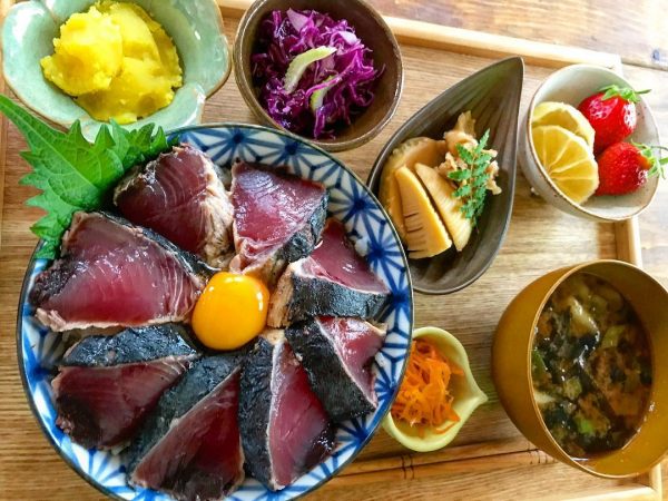 春の献立にかつおの漬け丼