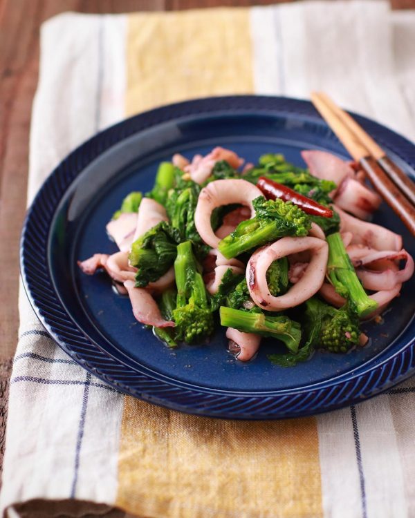 菜の花とイカのペペロンチーノ風炒め