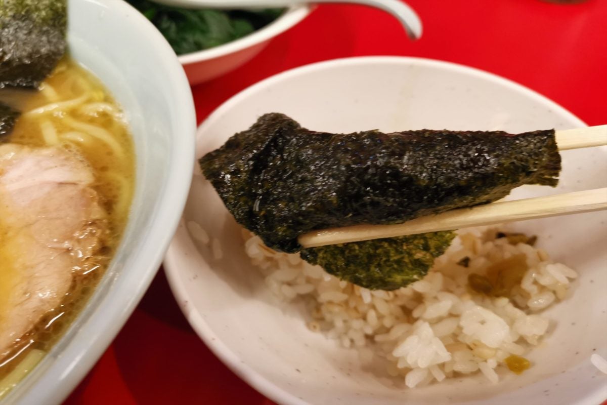 また、ラーメンについている海苔にスープをしみこませ、ご飯を巻いて食べる海苔巻きも格別。ビジネスホテルの味付け海苔では味わえない、究極の海苔巻きだ。
