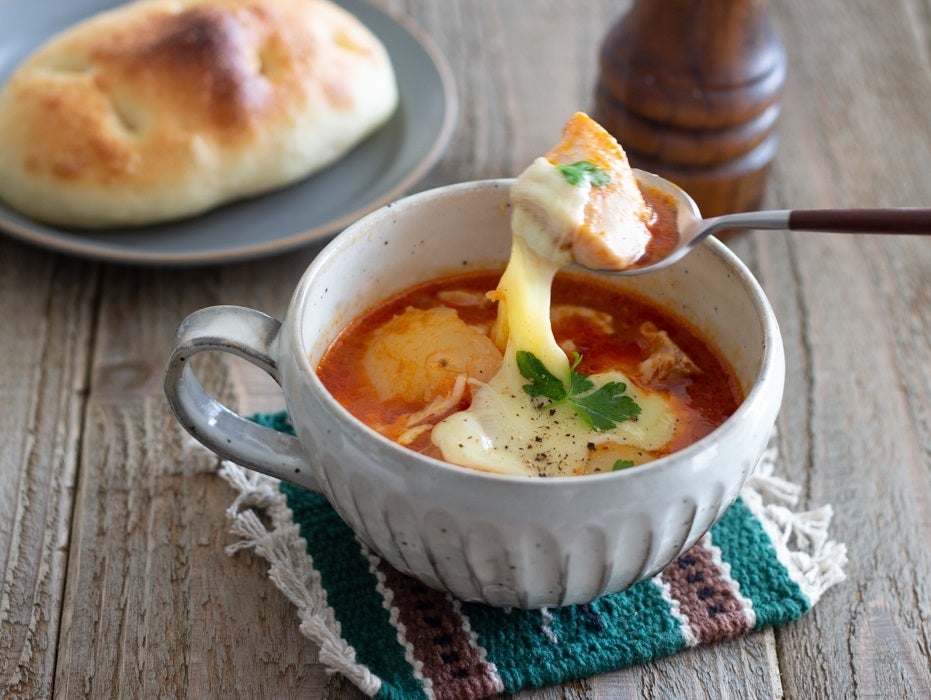 鶏肉とじゃがいもをごろりと入れたトマトスープに、チーズをとろり。食べ応えもあり、大満足!夕食にもおすすめです。