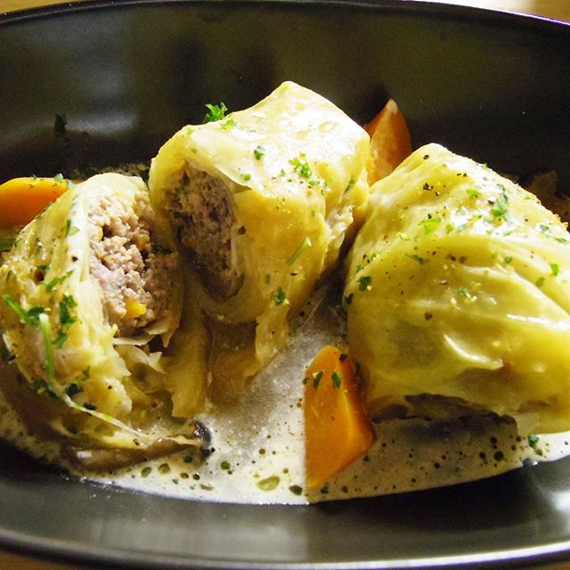芯をくり抜いて中身をかきだしたキャベツに、合いびき肉などで作ったハンバーグと同じタネを詰め込み、好みのスープの具材を入れて煮込んだら完成です。