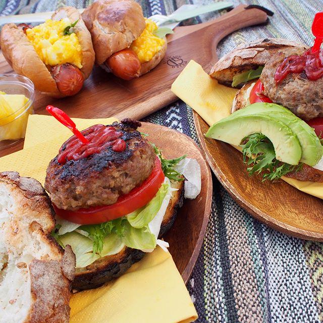 では、蓋で作るハンバーガーをご紹介しましょう♪焚き火料理で作ると手早くジューシーに仕上がります。