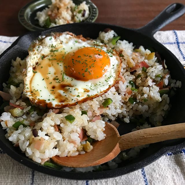 ご飯料理でおすすめなのが、チャーハンです。焚き火の火力とスキレットの熱の伝えやすさでパラパラにできます。