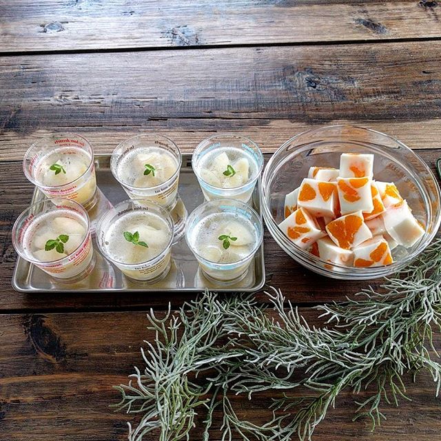 みかんは寒天寄せにしても美味しいです。こちらはみかんや蜂蜜と牛乳を合わせて、寒天で固めたお菓子。