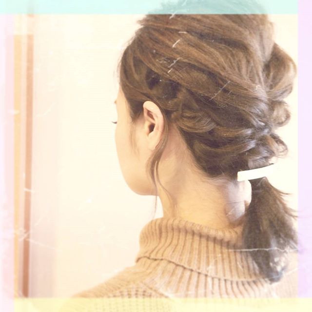 下の方で一つ結びを作った後にトップの毛を軽く敷き出し、ヘアアクセサリーで飾るだけの簡単アレンジ。