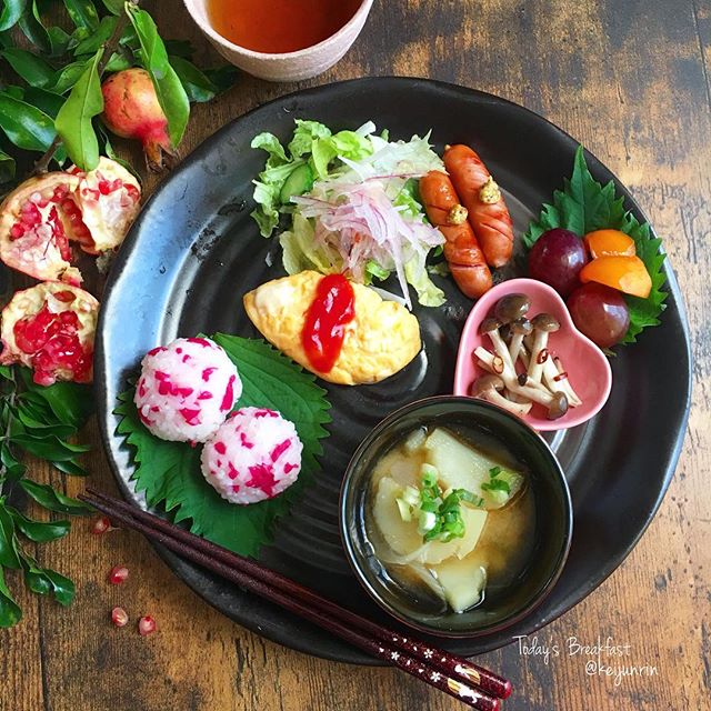 お皿の上にソーセージやオムレツ、じゃがいものお味噌汁などをのせてにぎやかにした朝ごはんです。