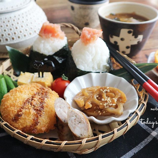 籠の中に明太子おにぎりやミンチカツ、レンコンのきんぴらなどを入れてボリューム満点にしたおすすめの朝ごはんです。