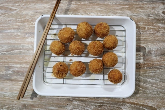 ④ 180℃に温めた揚げ油に➂を入れて、きつね色になるまでこんがり揚げて、網に取り出して油を切ったら、完成です!