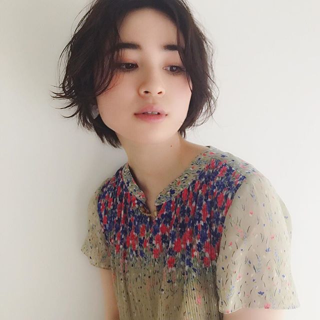 前髪をサイドと同じ長さにしておでこを出し、黒髪で知的に見えるショートボブ。襟足も短めで首長美人を叶えてくれる髪型です。
