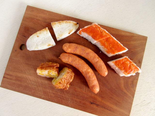 笹かま、したらば、もろこし揚げは切り、チョリソーには切れ目を入れておきましょう。