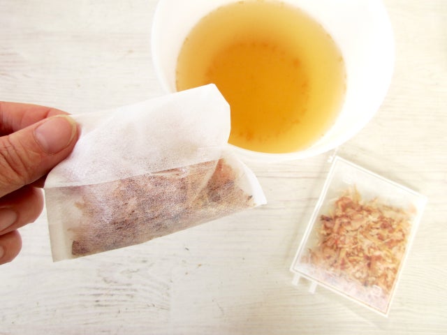 そこに、かつお節1パックをお茶用のパックに入れて、ポン。これで、かつおの香りがふわっと香る、極上おでん、できあがりです!